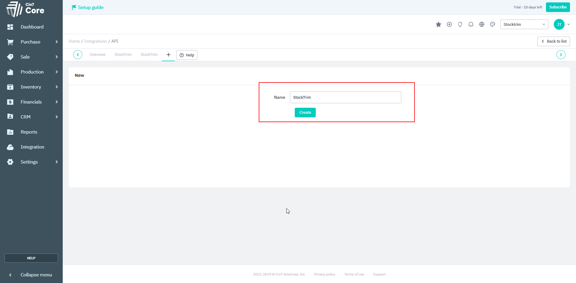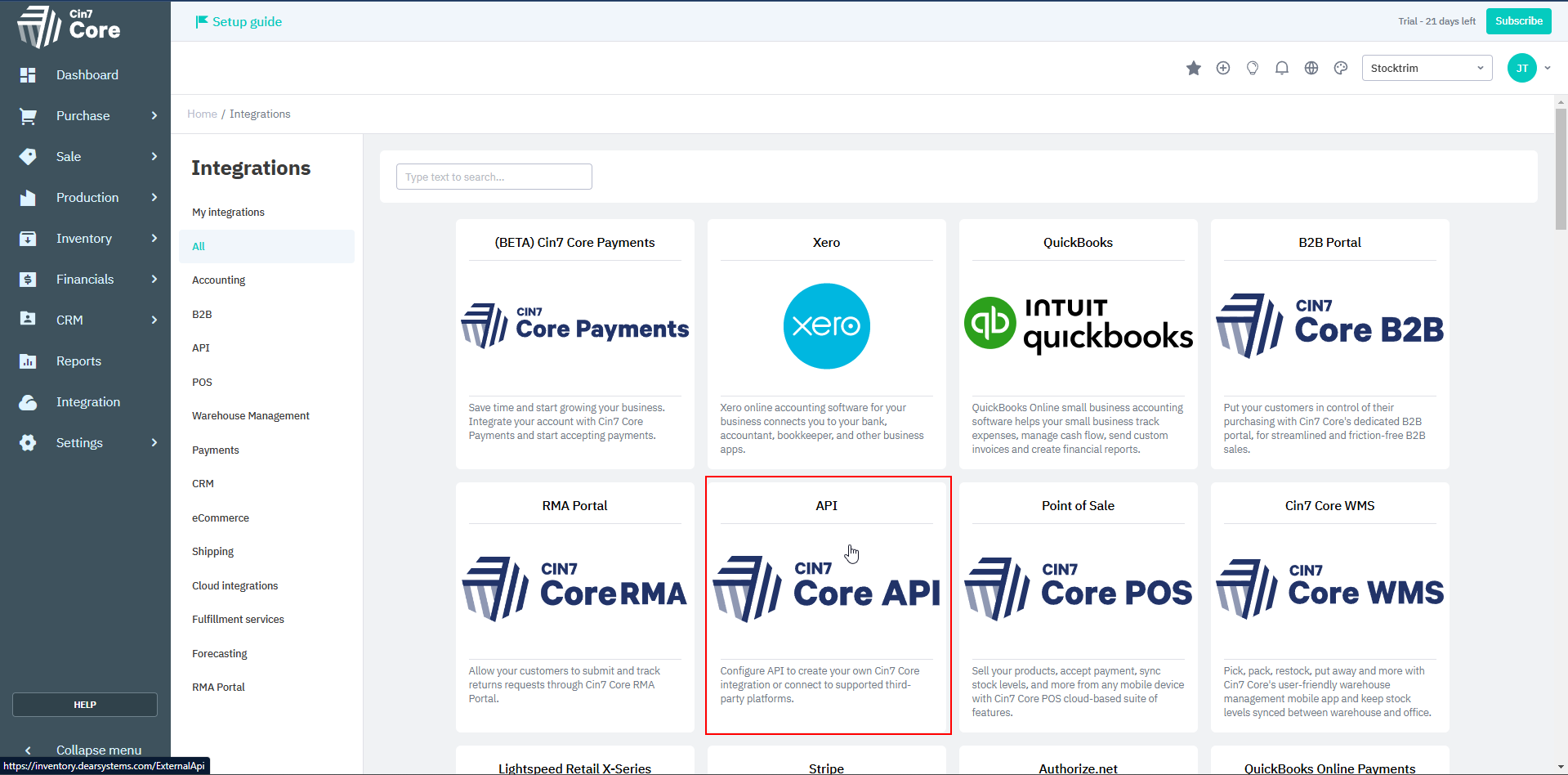 Then, select the 'Cin7 Core API' integration option