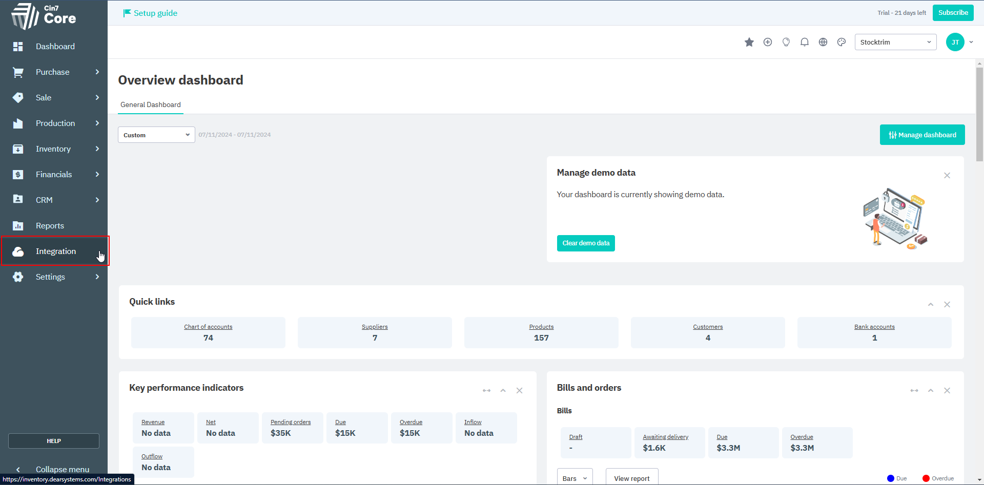 In Cin7 Core, log in as the administrator, and then select 'Integration' on the left navigation menu.